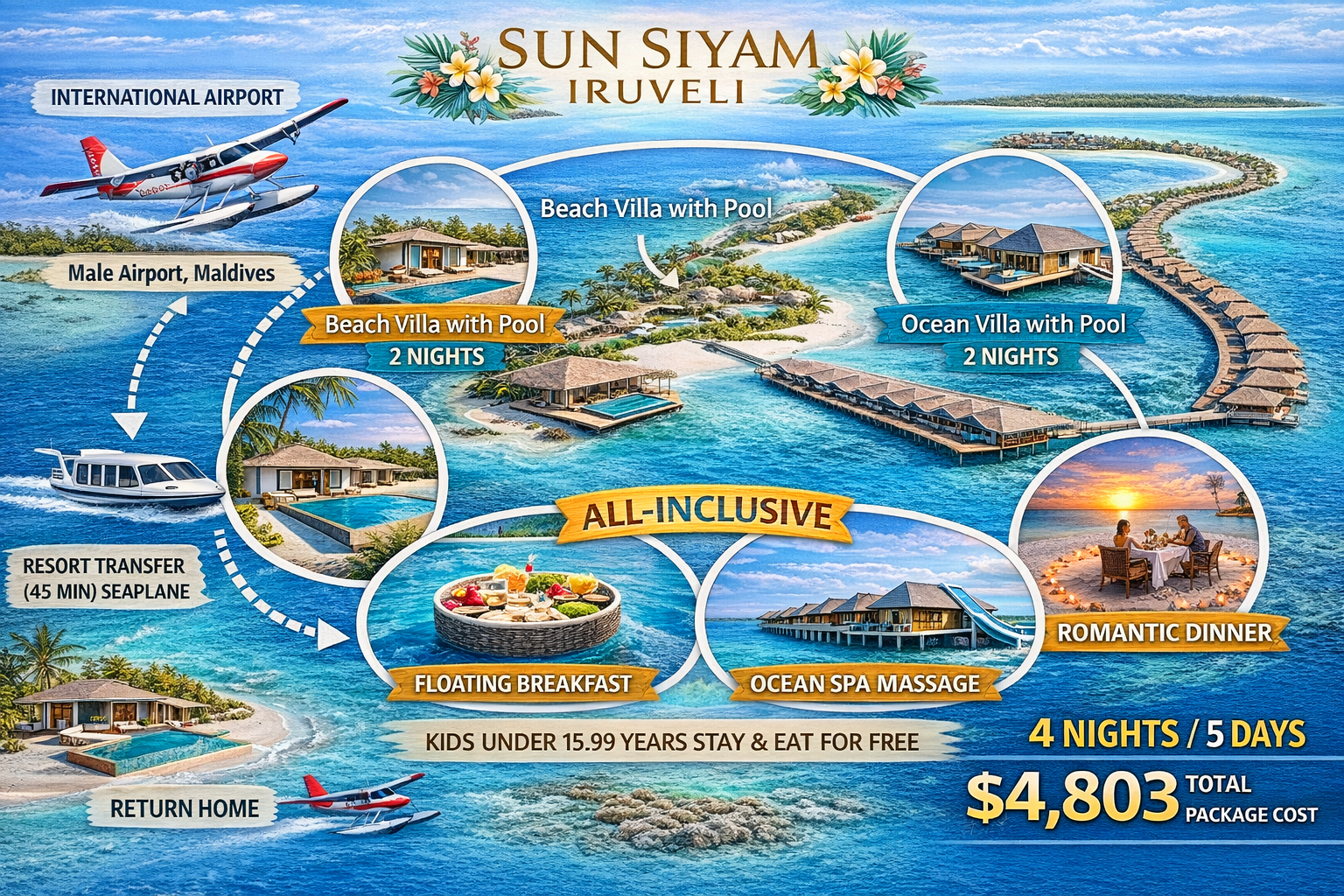 Enjoy a luxurious Maldives escape at Sun Siyam Iruveli, featuring elegant Beach Villas and Ocean Villas with private pools, along with scenic seaplane transfers and an all-inclusive meal plan. The stay includes special experiences like floating breakfast, spa treatments, and a romantic candlelight dinner, making it a perfect 4-night island getaway.