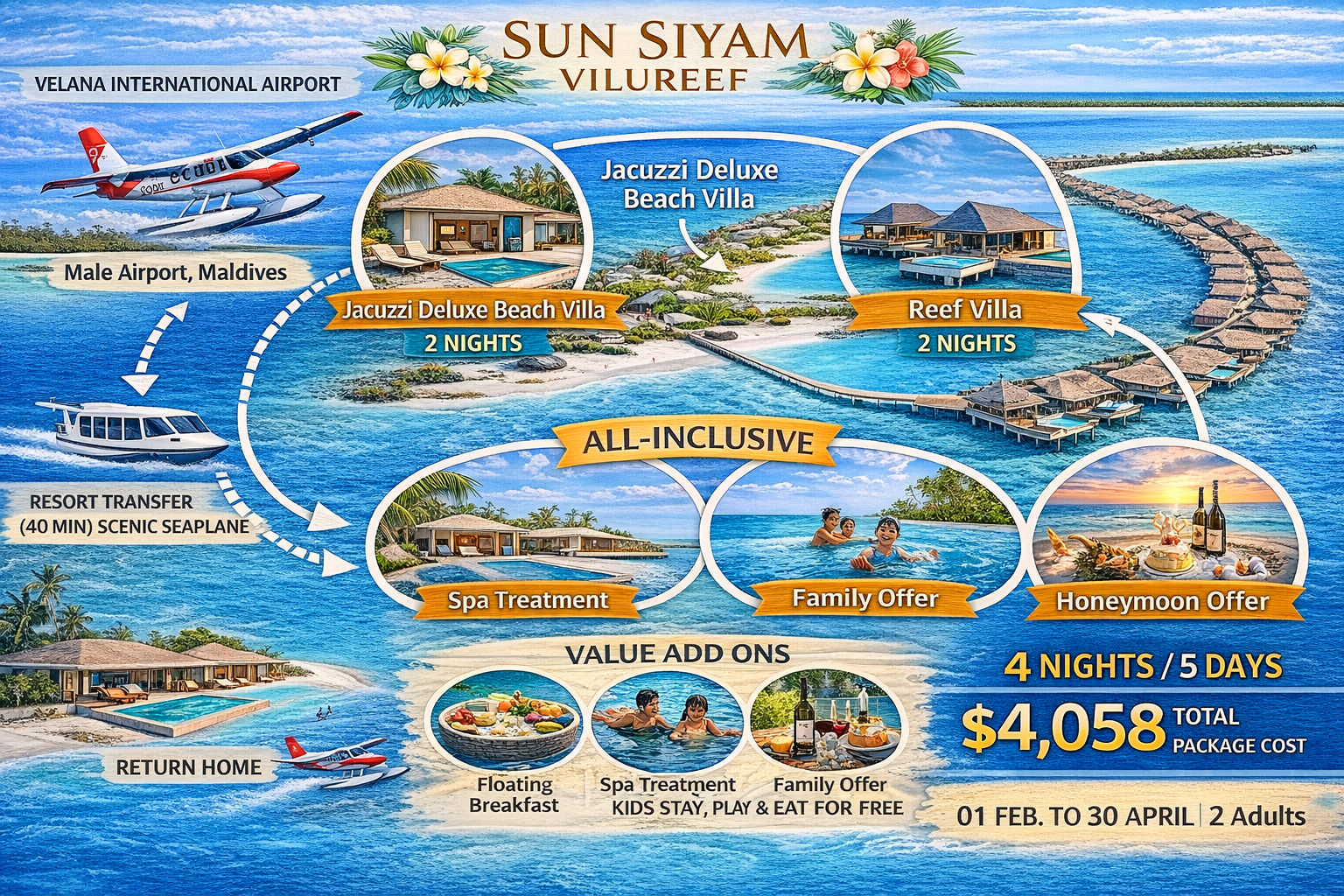 Experience a serene island getaway at Sun Siyam Vilureef, featuring stays in a Jacuzzi Deluxe Beach Villa and Reef Villa with scenic seaplane transfers and an all-inclusive meal plan. Enjoy special perks like floating breakfast, spa treatment, family offers, and romantic dining experiences during your relaxing 4-night Maldives escape.