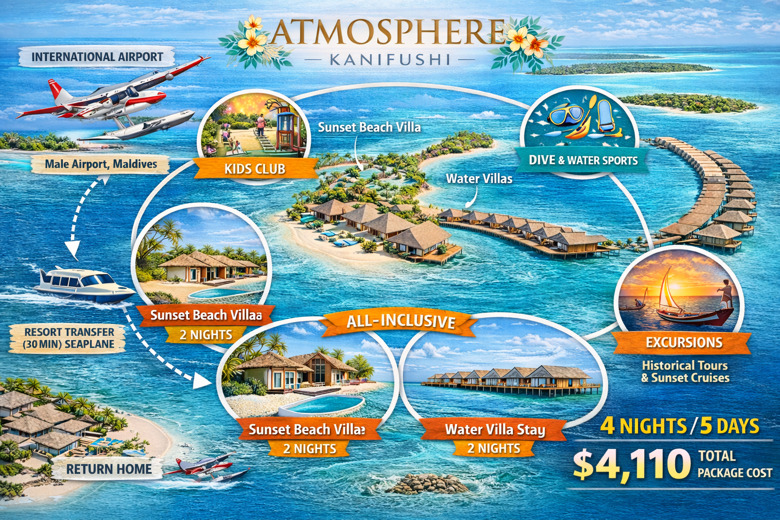 Experience a luxurious Maldivian escape at Atmosphere Kanifushi, featuring Sunset Beach Villas and Water Villas with all-inclusive dining and scenic seaplane transfers. Enjoy exciting ocean adventures, snorkeling excursions, cultural island trips, sunset cruises, and a variety of recreational activities for a perfect 4-night island getaway.