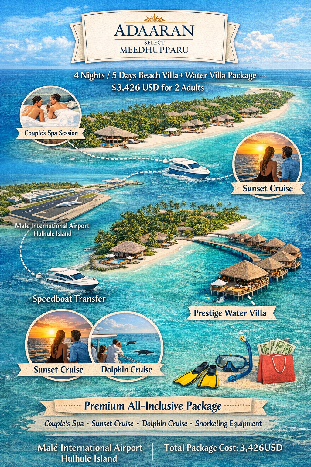 The package includes a 45-minute couple spa session, sunset cruise and dolphin cruise excursions, complimentary snorkeling equipment, AI beverage extension until departure, and special discounts on selected excursions, offering a perfect mix of relaxation and adventure in the Maldives.
