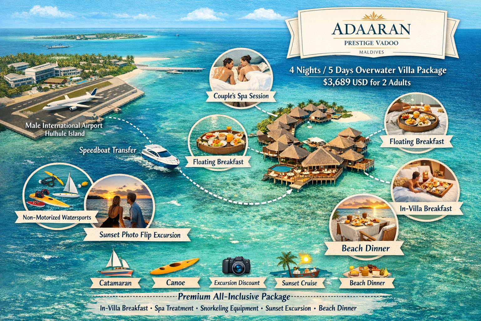 Experience a 4 Nights / 5 Days luxurious getaway at Adaaran Prestige Vadoo, staying in a private Overwater Villa for two adults with Premium All-Inclusive benefits, speedboat transfers, daily in-villa breakfast, a floating breakfast experience, spa treatment, complimentary snorkeling and watersports, sunset excursion, and exclusive dining experiences.